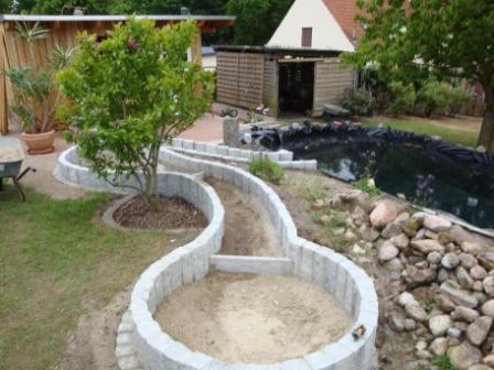 Der Bachlauf ist ca. 8m lang und 50cm breit. Ein Becken von 100cm Durchmesser oben und in der Mitte