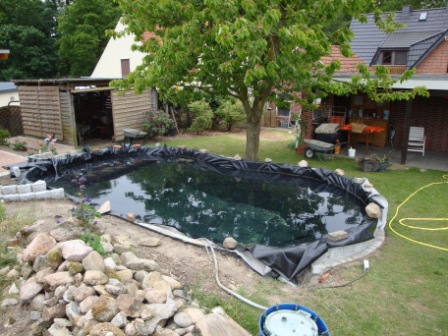 Teichgröße ist ca 20m² oberfläche und 10m³ Wasser. Geplant ist ein leichter bis mittlerer Fischbesatz.