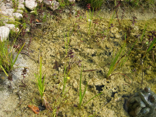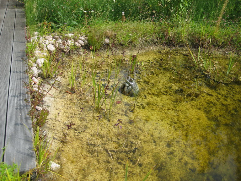Die Planzen die aus dem Wasser rausschauen (Binsen, Lilien, Schilf) wachsen nur sehr spärlich. Tausendblatt, Quellmoos unter Wasser wuchert. Seerosen gehts gut. Fische nur Moderlischen, aber gerne mal Molche und Frösche.