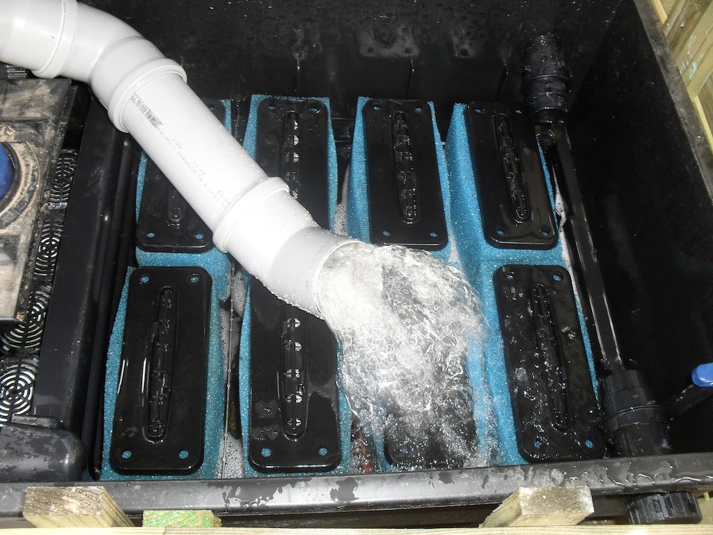 Diese Anlage ist ohne Vorfilter nicht funktionsfähig, mehr als 8.000 Liter gehen nicht durch diesen Filter ( Bitron und auch der Ausströmer sind dafür nicht ausgelegt, bei zu hohem Druck spritzt das Wasser über das Screenmatic Band drüber weg ), die Pumpe bringt jedoch die Menge von ca. 16.000 Liter, deshalb habe ich den Vorfilter mit einem zweiten Ausgang versehen müssen, sonst läuft dieser über. Über den Winter werde ich einen zweiten Filter an diesen Ausgang anschliessen, aber ganz sicher nicht von Oase!