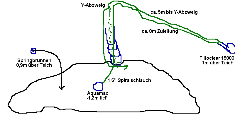 wir wollen den mit unserer Immobilie erworbenen Gartenteich modernisieren. Der Teich hat ein Volumen von 3750l, ist 5.0 x 2.2m und 1.2m tief, enthält zwei Koi (30-40cm) und 9 weitere Fische (Schleierschwanz, Goldfische, ..?, 10-20cm). Insgesamt enthält der Teich 3 Pumpen: eine 85W Umwälzpumpe, eine Heissner Aquacraft (2100l/h, 35W) die den (ehemals defekten) Druckfilter mitsamt nachgelagertem Bachlauf und eine Heissner P5000, die (mit einem Y-Verteiler und rund 80% ungenutzer Kraft) eine Springbrunnenfigur speist. Die Bachlaufpumpe ist unsinngerweise 20cm unterhalb des BAchlaufs angebracht, so dass die Filterleistung gleich null ist. Letztes Jahr hatte ich bereits den defekten Filter gegen einen Filtoclear 15000 ersetzt, wohl wissend, dass ich dieses Jahr den Rest des Teiches moderniseren wollte. Die Bachlaufpumpe ist aktuell über einen 3/4"-Spiralschlauch an Filter und Bachlauf angeschlossen.