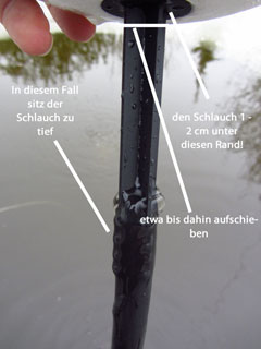wie der Schlauch aufzustecken ist: dem habe ich nichts mehr hinzuzufügen. Im Bild habe ich die Stellen gekennzeichnet. Macht man es nicht so, kann es zum Einfrieren des Teichs kommen, da keine Brechung und Verteilung der Bewegung des Wassers geschieht.