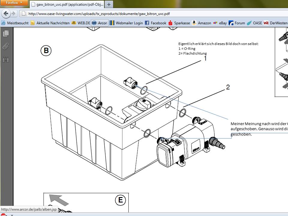 habe jetzt versucht das Bild von der OASE Beschreibung als Anhang im JPEG Verfahren zu bearbeiten und anzuhängen. Wobei es sich mir nicht verständlich ist, wo das Problem liegt :roll: .....2 Flachdichtungen, zwei O-Ringe. Beide werden über der Schraubbefestigung aufgedreht, anders dürfte es auch gar nicht gehen......... :whistling: