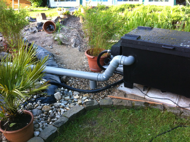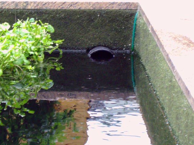 Das Auslauf-Rohr reicht so weit in den Teich herein, weil damit eine Rotation im Wasser erzeugt werden soll(te?).