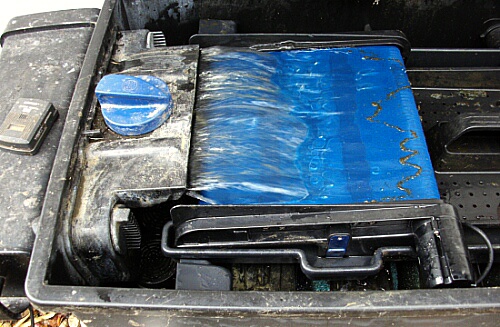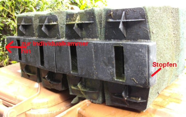 Ich drücke die Hälfte der Schwämme ein paar mal aus, Schmutzwasser ablassen, neu befüllen (bis Höhe Auslauf) und das ganze von vorn.