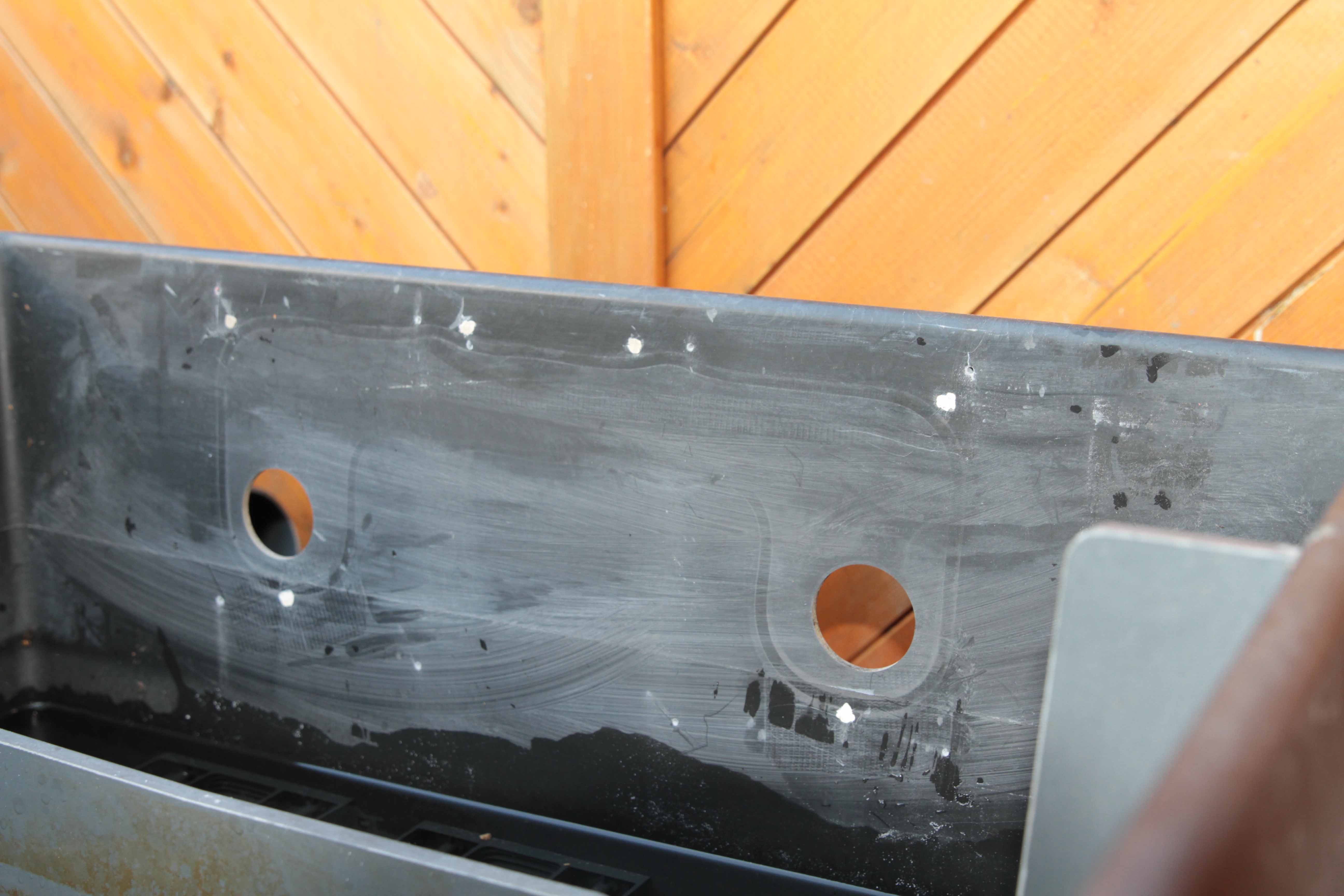 Wie man auf den Fotos ersehen kann, waren einige vorbereitende Arbeiten notwendig. Ich habe mit Hilfe des neuen Wasserverteilers eine Schablone angefertigt, um die neuen Bohrungen in der Filtergehäuseseitenwand zu markieren. Als Festpunkte dienten mir die beiden großen Durchlassöffnungen für den UV-Filter. Nach dem Bohren der neuen Schraublöcher habe ich die alten Schraublöcher mit 2-K-Spachtel verschlossen. Um den Kontakt der Spachtel mit dem Filtergehäuse zu gewährleisten, habe ich die Bohrlöcher mit einem kleinen Metallbohrer und Feile aufgerauht und nach dem Spachteln außen und innen dünn mit Epoydharz gestrichen. Zur Beschleunigung des Trocknungsvorgangs habe ich mit einem Heißluftfön nachgeholfen.