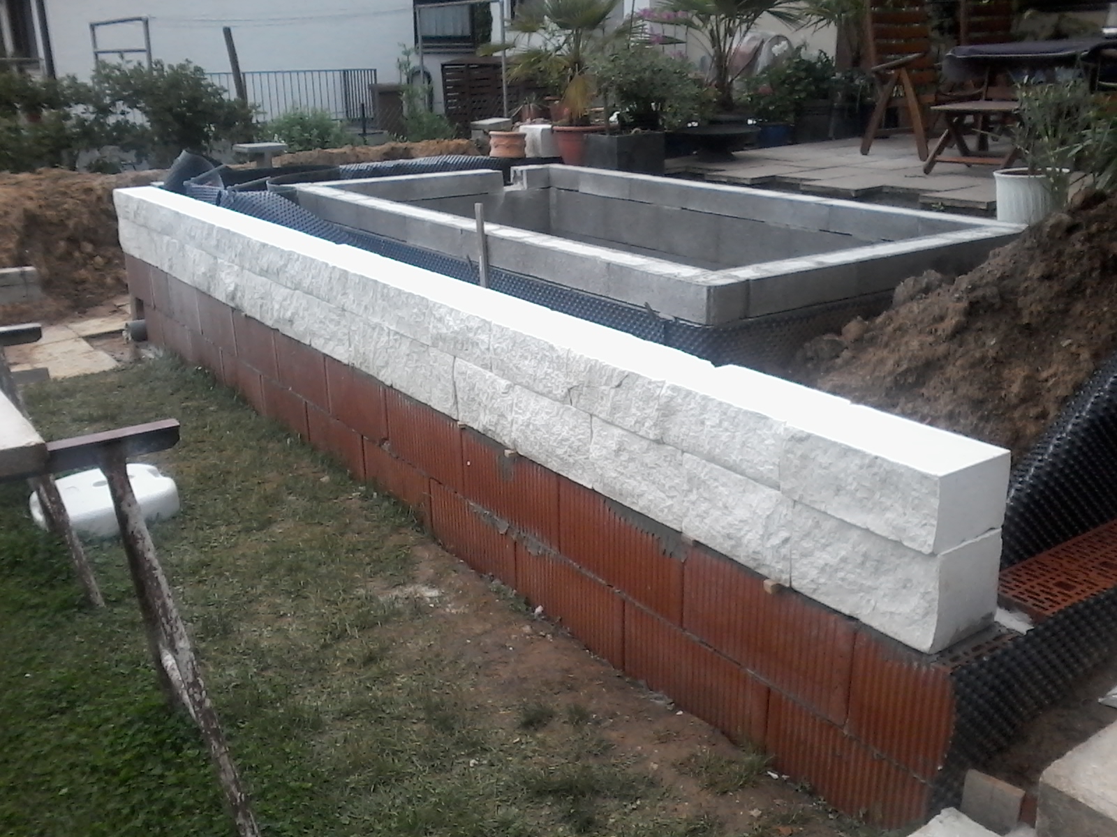 Ja, wir werden auf den oberen Rand noch eine Abdeckung bauen. Die Zuleitungen wollen wir durch eine Aussparung am oberen Rand der Teichmauer führen (siehe Bilder).