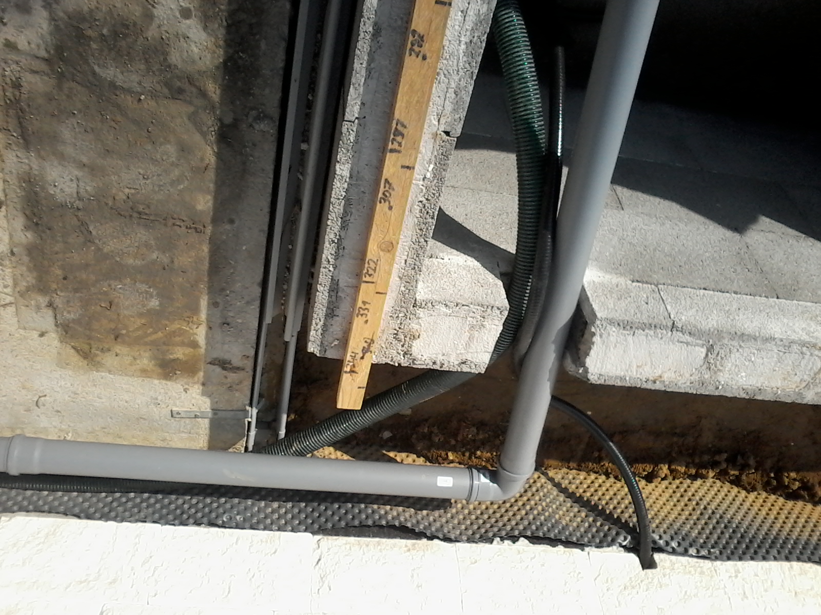 Da wir aber einen Mauerdurchbruch zur Ausleitung der verschiedenen Leitungen und Kabel haben (siehe Skizze und Bilder) und keine Idee wie wir das dicht bringen, wurde uns empfohlen, die Folie an dieser Stelle auszuschneiden und unterhalb des Durchbruchs zu befestigen und den Wasserspiegel darunter zu halten.