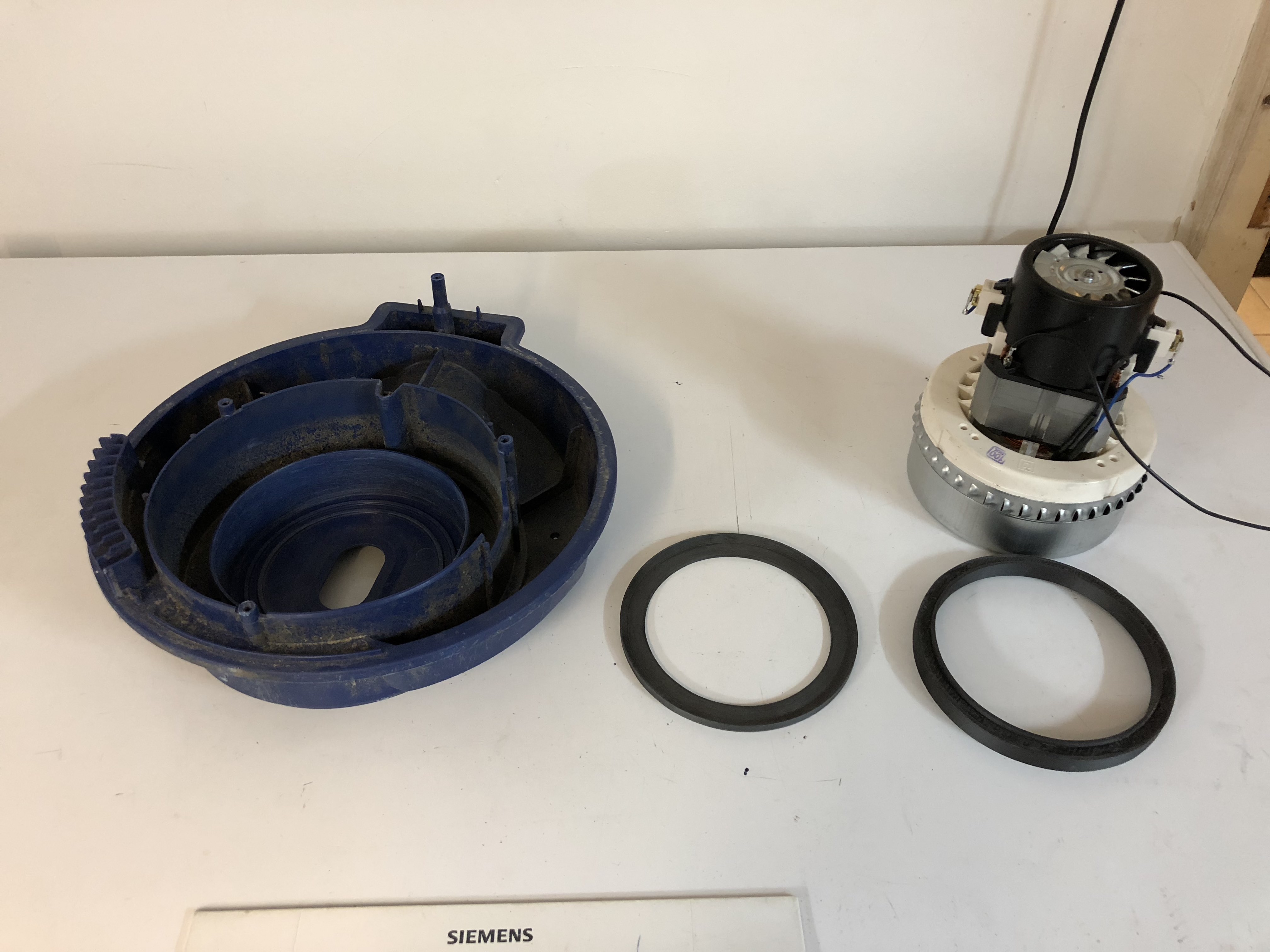 Es wird eine 2-stufige Staubsaugerturbine von Domel mit 1400W (Artikel-Nr.: 492.3.788). Der Unterschied besteht darin, dass die Turbinenhöhe und der gesamte Saugmotor höher ist wie der Originale. Deshalb müssen die Dichtringe, womit das Turbinengehäuse oben und unten abgedichtet ist weg und gegen andere Dichtungen ersetzt werden. Ich denke ich werde da Ringe per 3D-Druck anfertigen und diese dann mit Dichtmasse einsetzten.