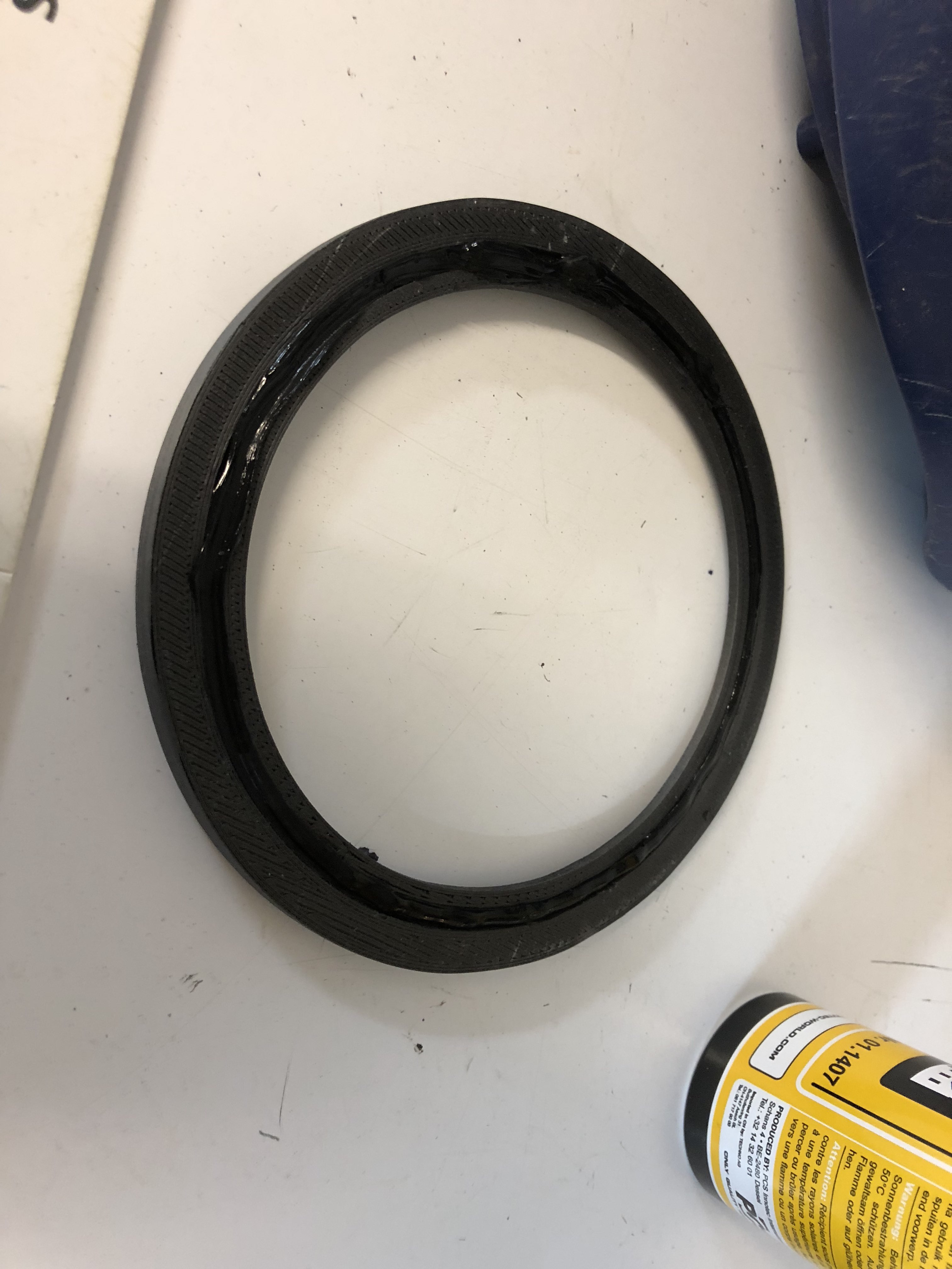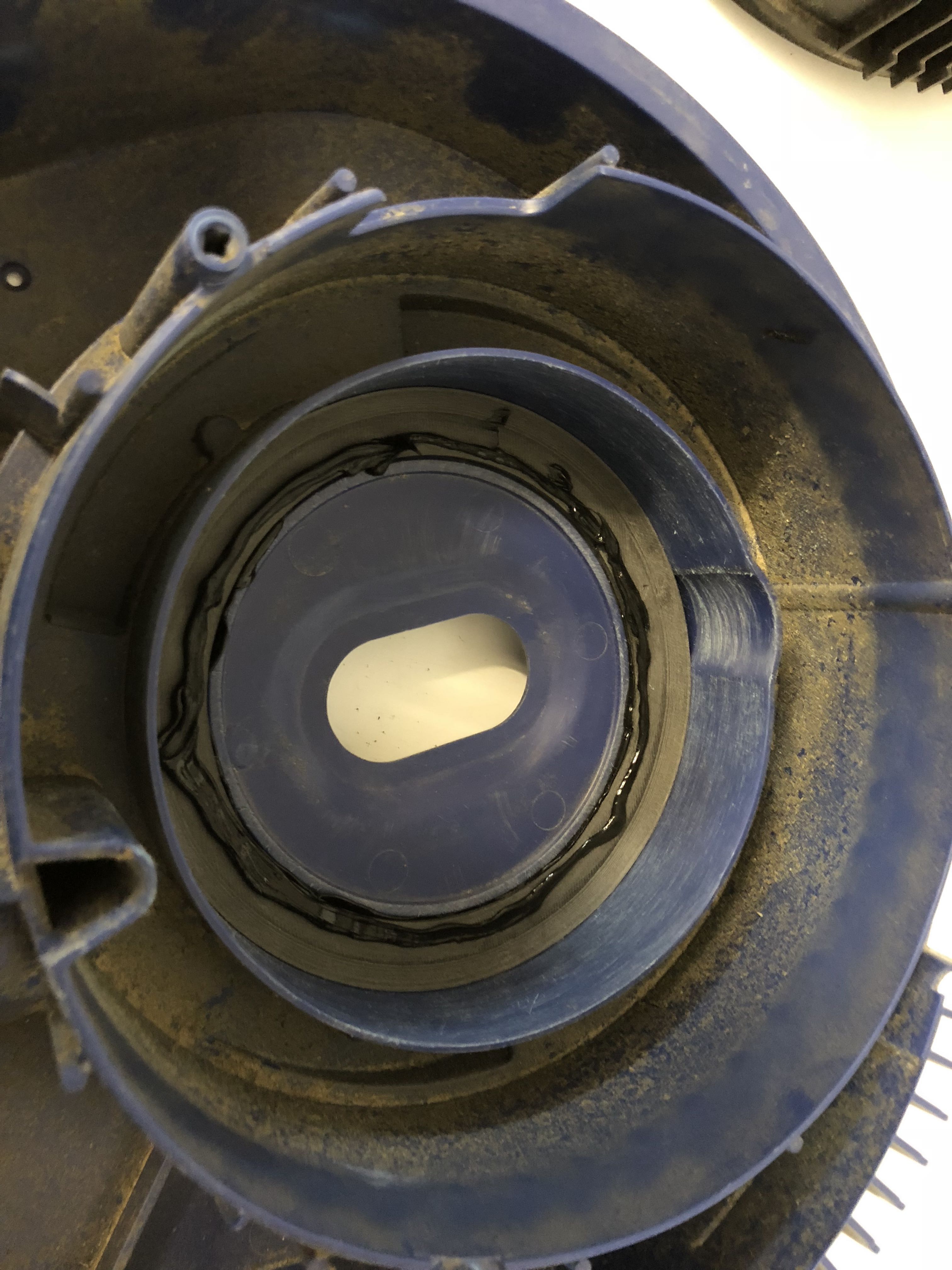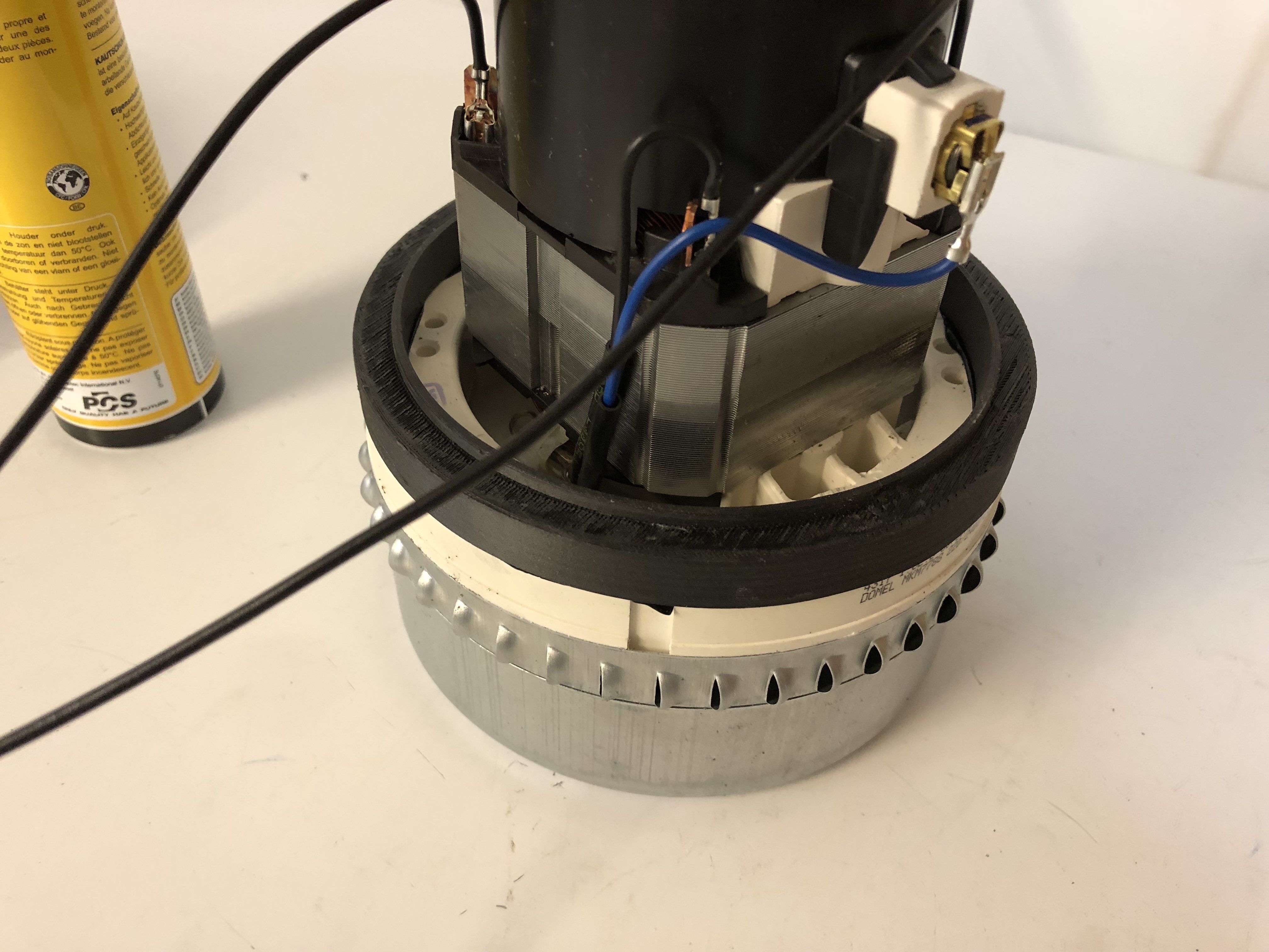 Der alte Motor hat am Turbinengehäuse 2 dicke Gummidichtungen. Diese dichten einmal Zu- und Abluft des Saugmotors gegeneinander und einmal zur Motorseite (Wicklung) hin ab. Da das neue Turbinengehäuse größer ist musste ich die Gummidichtungen gegen andere austauschen. Ich habe mir dazu mit meinem 3D Drucker Distanzringe ausgedruckt, welche ich dann mit Innotec abgedichtet habe.