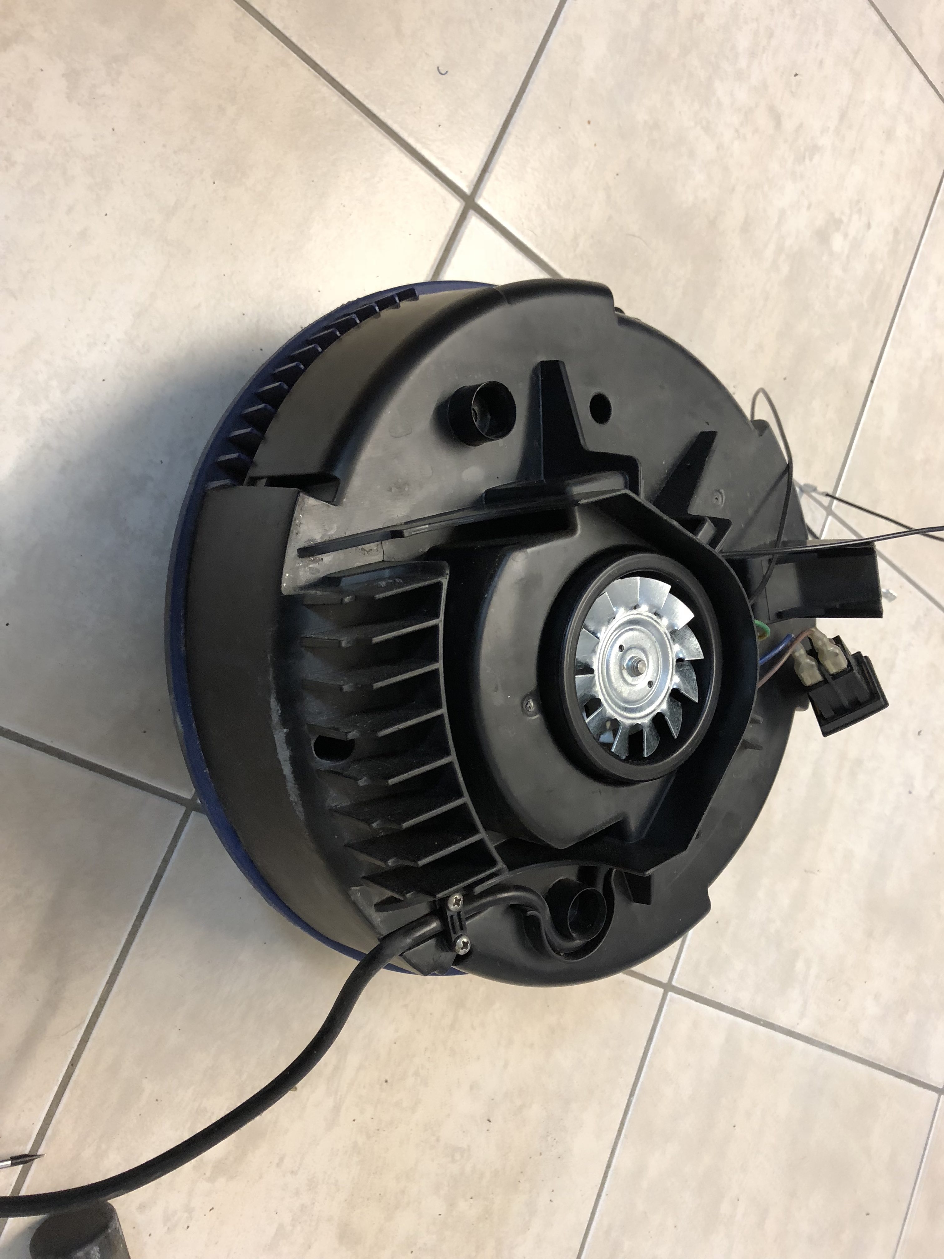 Der Durchmesser des Turbinengehäuse ist leider auch minimal größer wie der alte Motor. Somit musste ich das Gehäuseteil wo die Turbine drin steckt etwas ausschleifen (Blaues Gehäuseteil). Dan Motor habe ich dann wieder genauso angeschlossen wie den alten inkl. dem Entstörkondensator.