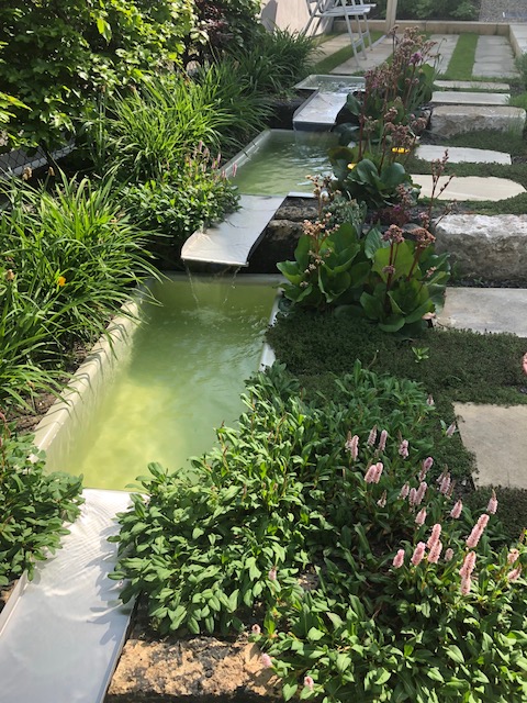 ich habe mir im letzten Jahr ein sehr schönes Wasserspiel bauen lassen. Dieses besteht aus 4 Plastbecken, Ausgleichsgefäß und entsprechender Technik (Pumpe, Nachspeisung etc.). Wasser wird aus einer Regenwasserzisterne verwendet.