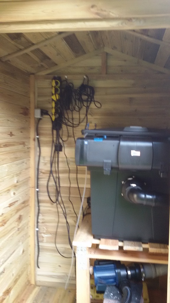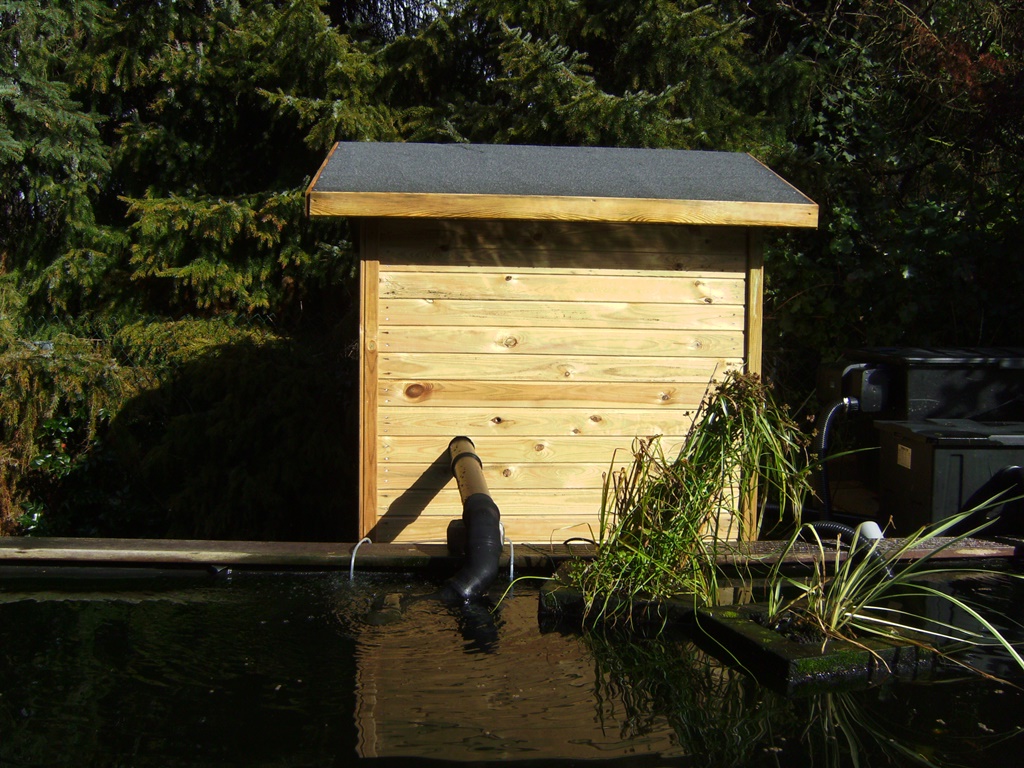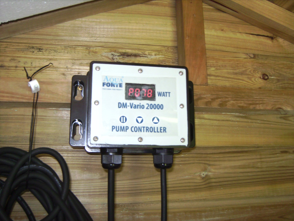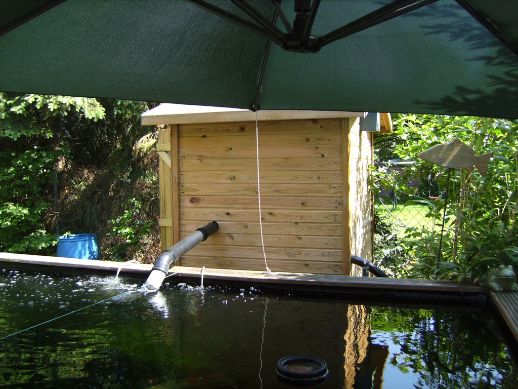 Hallo zusammen, ich muss ein bisschen ausholen, um den genauen Verlauf unseres Problems darzustellen. Wir haben im letzten Herbst den neuen Oase Scrennmatic " 90.000 Ltr. Filter gekauft und ihn gleichzeitig mit dem vorhandenen älteren Screenmatic 36 einlaufen lassen. Kurz vor dem Winter wurde der andere Filter, der auf dem Bild hinter dem Haus steht, abgebaut. Es läuft (lief) alles prima, im Winter haben wir eine Heizung, die sich bei unter 8 Grad anstellt. Wir hatten dazu eine Aqua Forte Pumpe 13.000 ltr. die trocken aufgestellt war. Wir haben neben dem Teich unser "Filterhäuschen", wo alles drin ist. Das Wasser ist klar und man kann bis auf den Boden sehen.