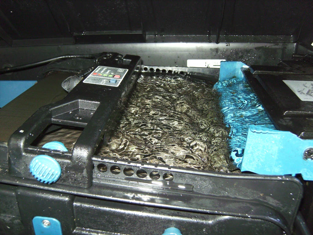 Nur haben wir jetzt das Problem, dass zuviel Wasser auf das Förderband läuft, selbst wenn wir die Pumpe ganz niedrig stellen, die LED blinkt ständig rot.