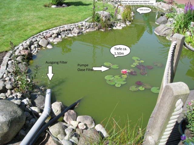 Desweiteren haben wir einen Bachlauf, der von einer anderen Pumpe ebenfalls gespeist wird, ich hänge noch eine Übersicht vom Teich als Anhang bei. Uns wurde gesagt, dass die Umwälzung des Wasser zwar nicht soo optimal ist, wenn der Bachlauf jedoch ständig gespeist wird, es dennoch klappen sollte.