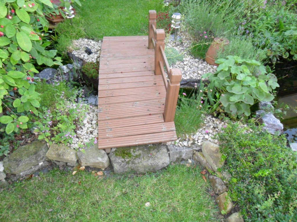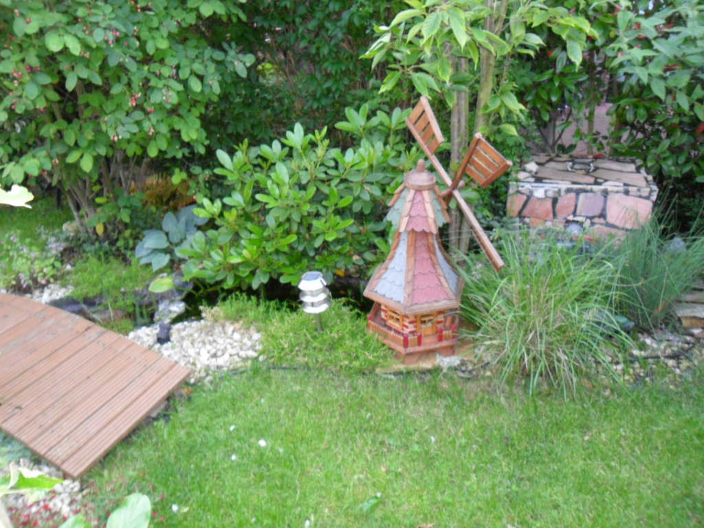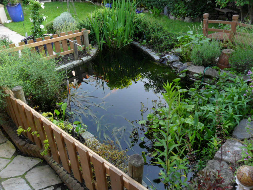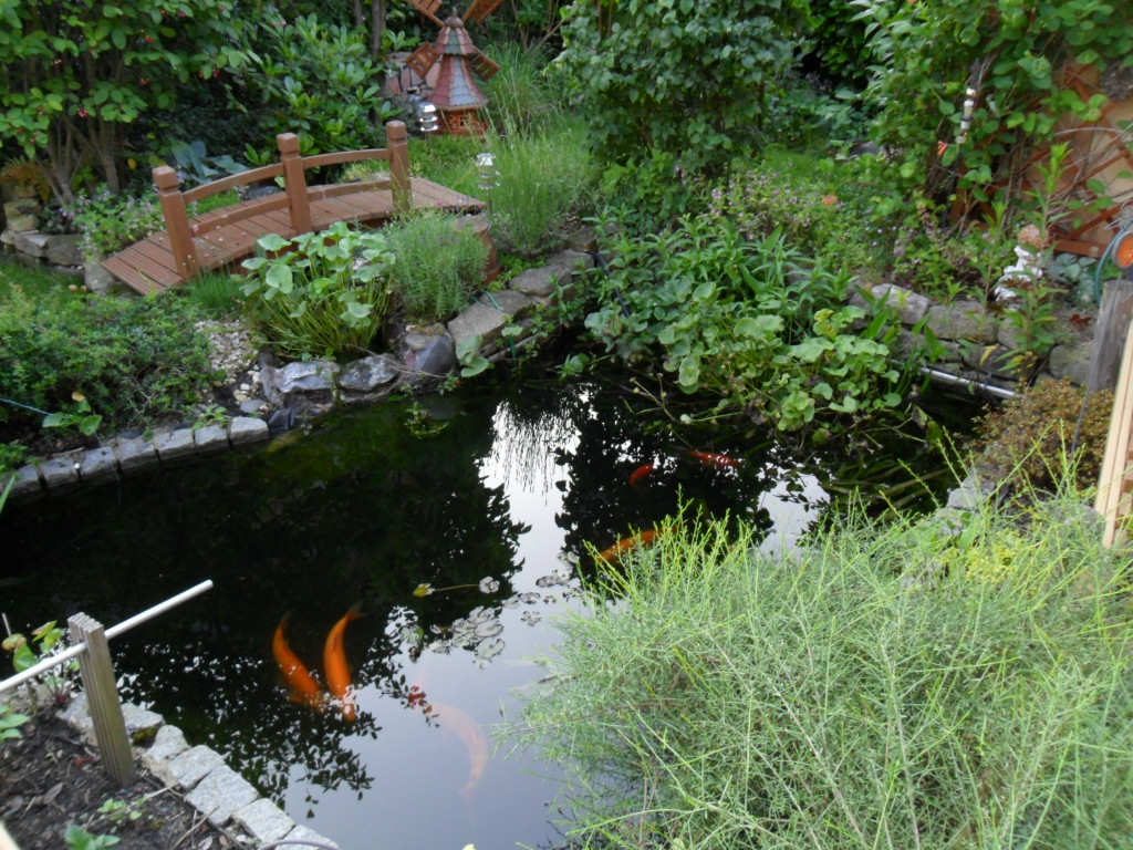 Zum Teich: Er hat ca. 7 m³ und beinhaltet 5 Goldorfen, 3 Goldfische und vormals 7 Gründlinge (z. Zt. wahrscheinlich 50 !). Der Teich hat eine relativ kleine Oberfläche (ca. 3,5 x 2,5 m), ist aber 1,80 m tief. Die Uferbepflanzung habe ich aus Kapazitätsgründen auf von mir ernannten "Cocktailtischen" (aus Granit) gepflanzt. Ich habe den Teich vor ca. 7 Jahren angelegt und bin eigentlich ganz zufrieden, wenn mich nicht das Reinigungssystem z. Zt. so nerven würde (bei Verstopfung ist immer spontaner Einsatz gefragt).
