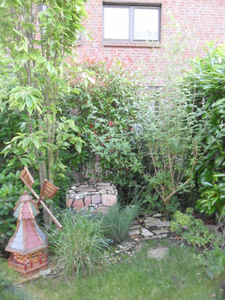Foto 01 zeigt noch einmal deutlich den Abstand zum Nachbarhaus. Polygonalplatten vorne - darunter "verbirgt" sich ein 15 l Druckfilter(wegen starker Algenbildung nachträglich instaliert), dahinter eine 30 Watt Pumpe, welche das Wasser dann in den Oase Filter fließen läßt (Höhendifferenz ca. 50 cm). Bei einem größeren Druckfilter wäre dieses jedoch überflüssig und die Pumpe könnte bei halber Höhe (max. 30 cm!!) direkt in den Bachlauf pumpen.