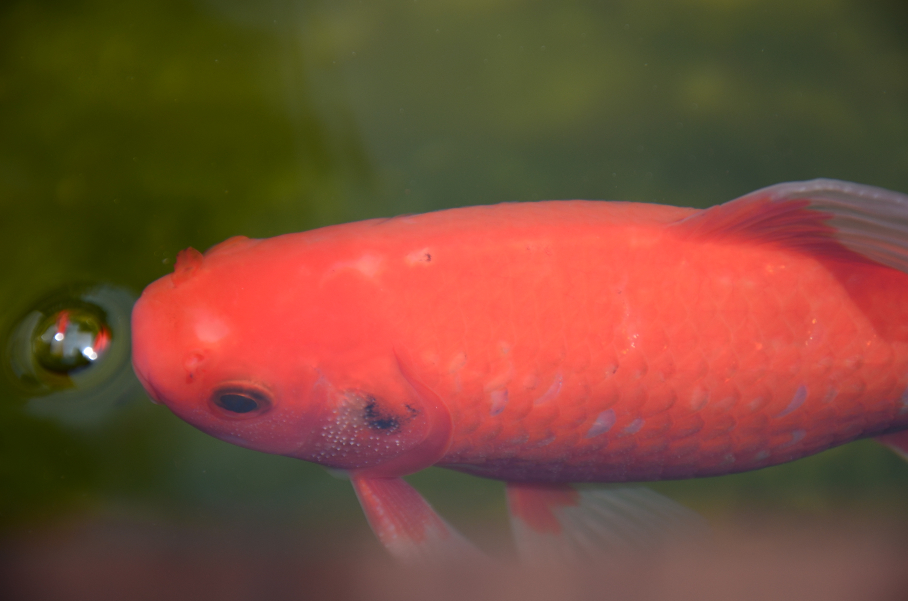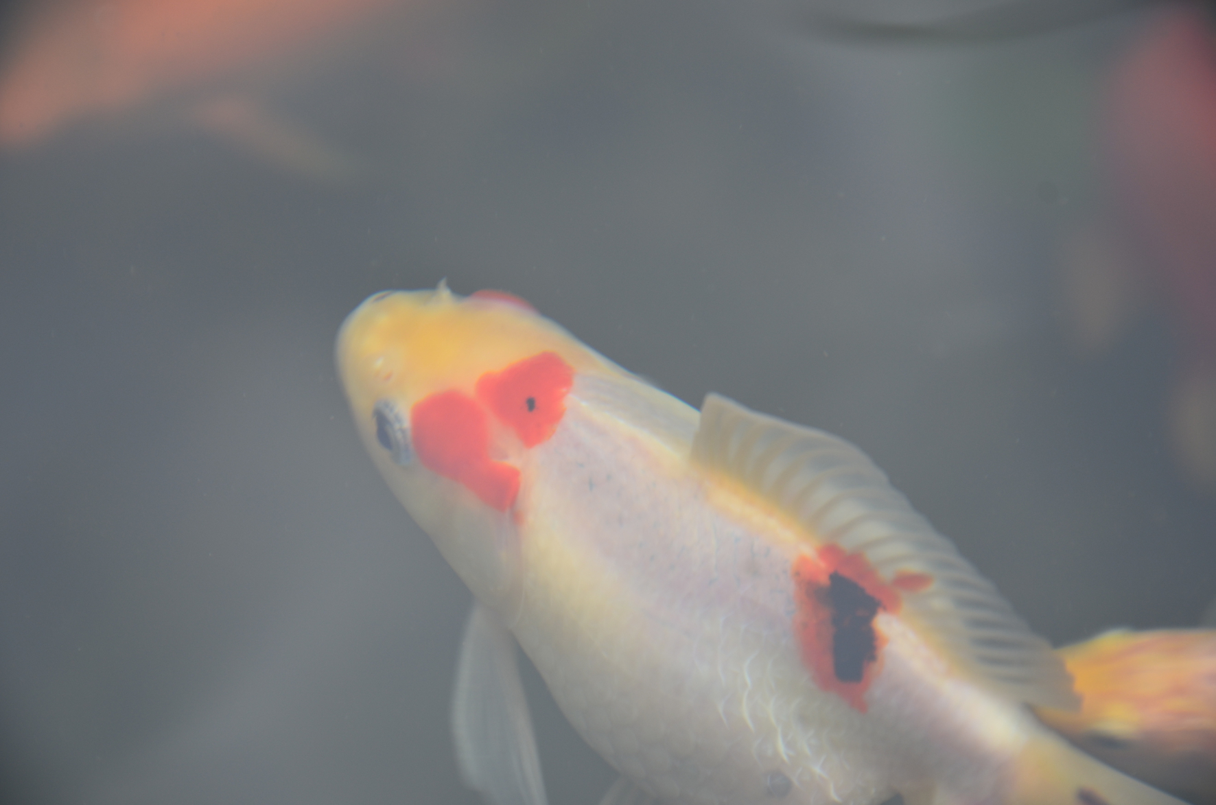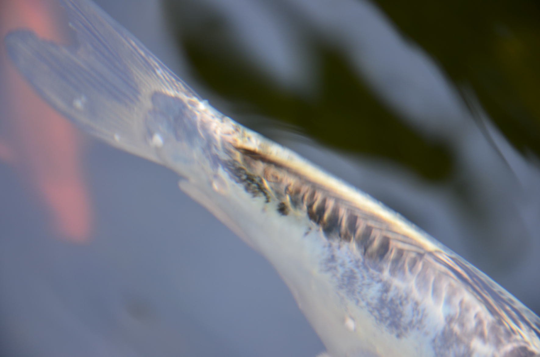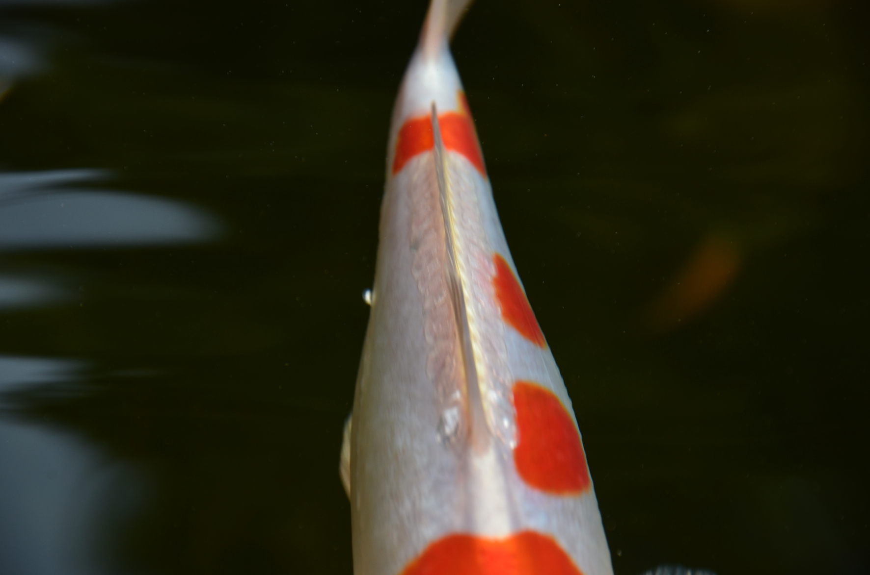Beim weiß-roten Koi hat sich nicht viel verändert, hier sieht man aber im Moment einen kleinen Stachel aus dem Pickel herausschauen. Auch hinten vor der Flossen sitzt irgendwas in der Schleimhaut.