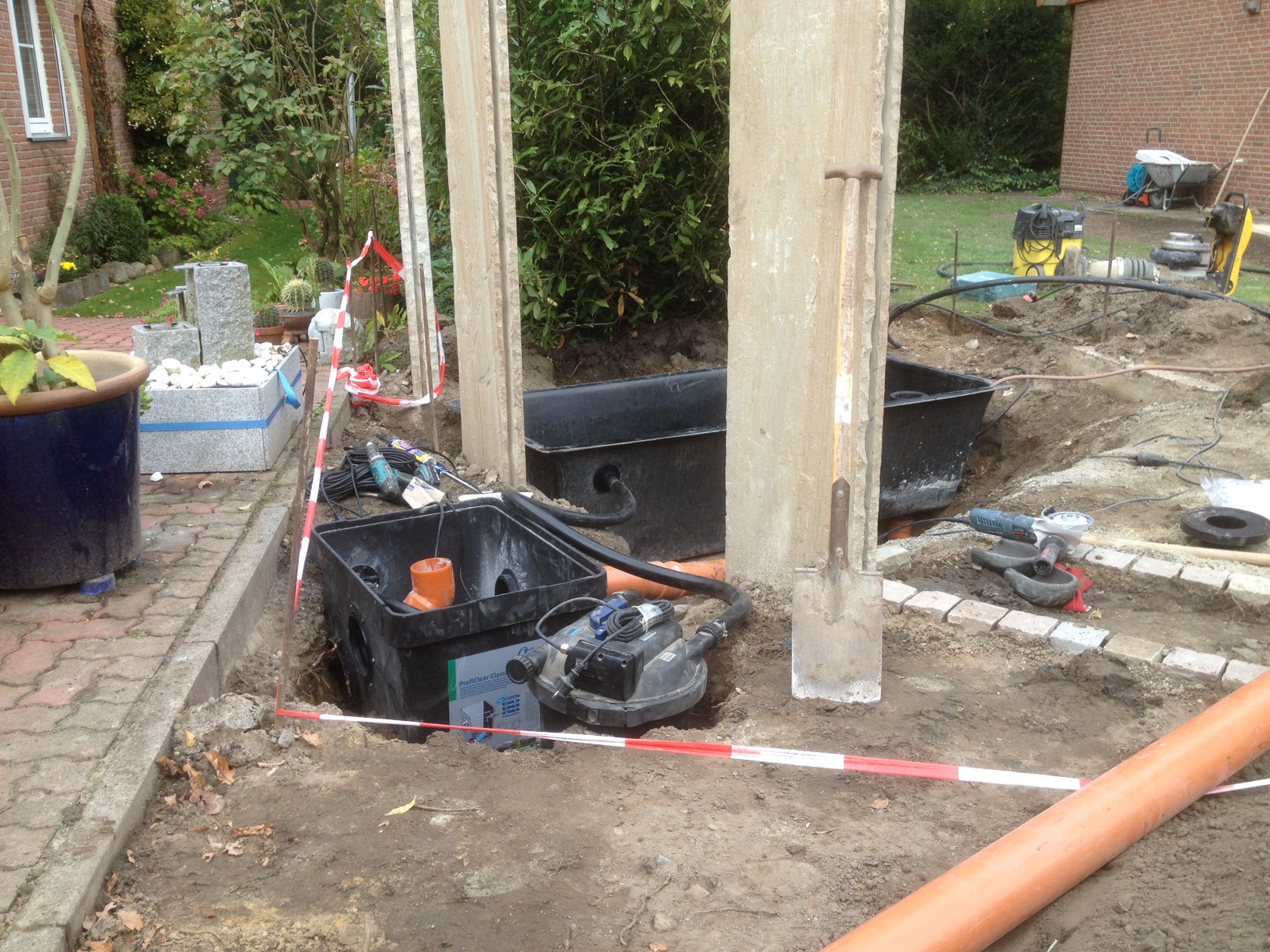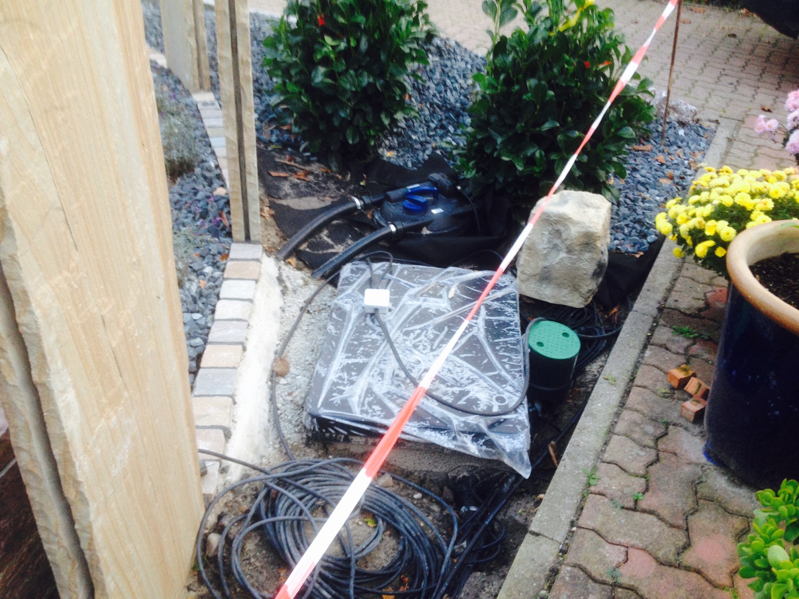 dann habe ich ein foto vom bau gemacht, da sieht man den filtoclear mit den anschlüssen und den starren, leider einbetonierten schläuchen. da ist also nicht viel platz, um was anzuflicken und die anschlüsse zu tauschen ||