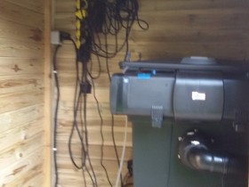 Hallo zusammen, ich muss ein bisschen ausholen, um den genauen Verlauf unseres Problems darzustellen. Wir haben im letzten Herbst den neuen Oase Scrennmatic " 90.000 Ltr. Filter gekauft und ihn gleichzeitig mit dem vorhandenen älteren Screenmatic 36 einlaufen lassen. Kurz vor dem Winter wurde der andere Filter, der auf dem Bild hinter dem Haus steht, abgebaut. Es läuft (lief) alles prima, im Winter haben wir eine Heizung, die sich bei unter 8 Grad anstellt. Wir hatten dazu eine Aqua Forte Pumpe 13.000 ltr. die trocken aufgestellt war. Wir haben neben dem Teich unser "Filterhäuschen", wo alles drin ist. Das Wasser ist klar und man kann bis auf den Boden sehen.